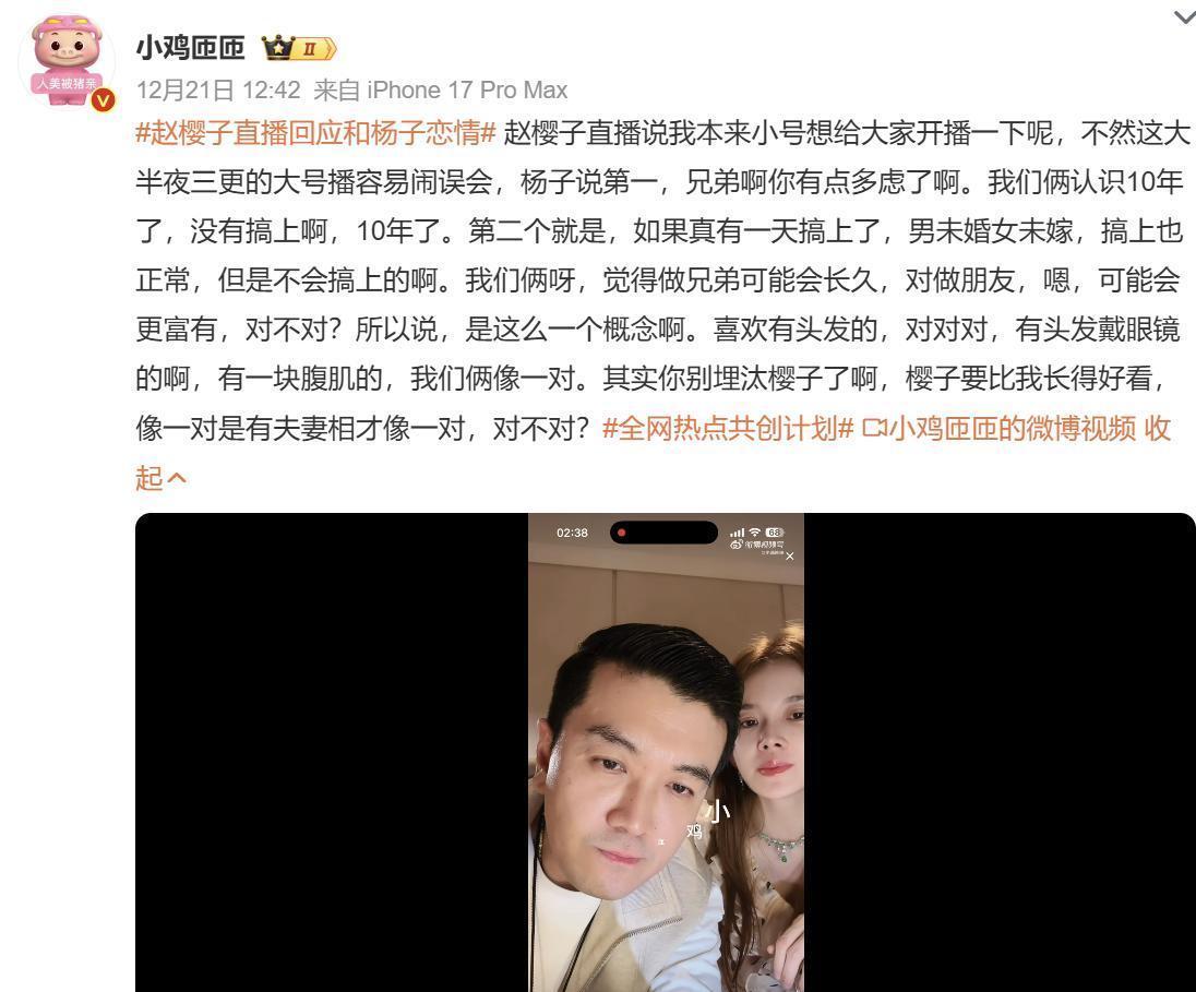 赵樱子最近又和杨子同框直播,两人一唱一和,弹幕直接炸了:“这俩人迟早凑一对。”杨子嘴上否认得挺快,说认识十年都没成,但转头又补一句:“真在一起也不犯法,男未婚女未嫁嘛。”一边否认,一边留缝,话里话外全是戏。