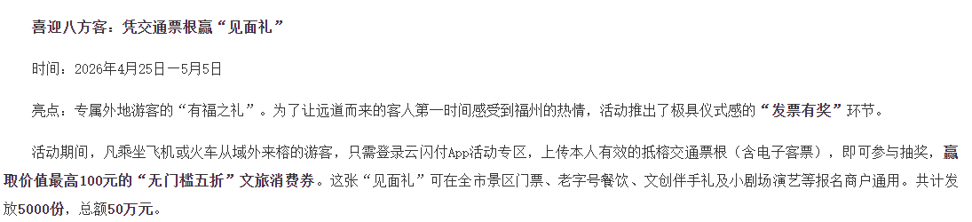 贵州:凭火车票等票根,可领取“吃住行游购娱”专属优惠券包; 福建福州:凭外地抵榕交通票根,可参与抽奖赢取文旅消费券;