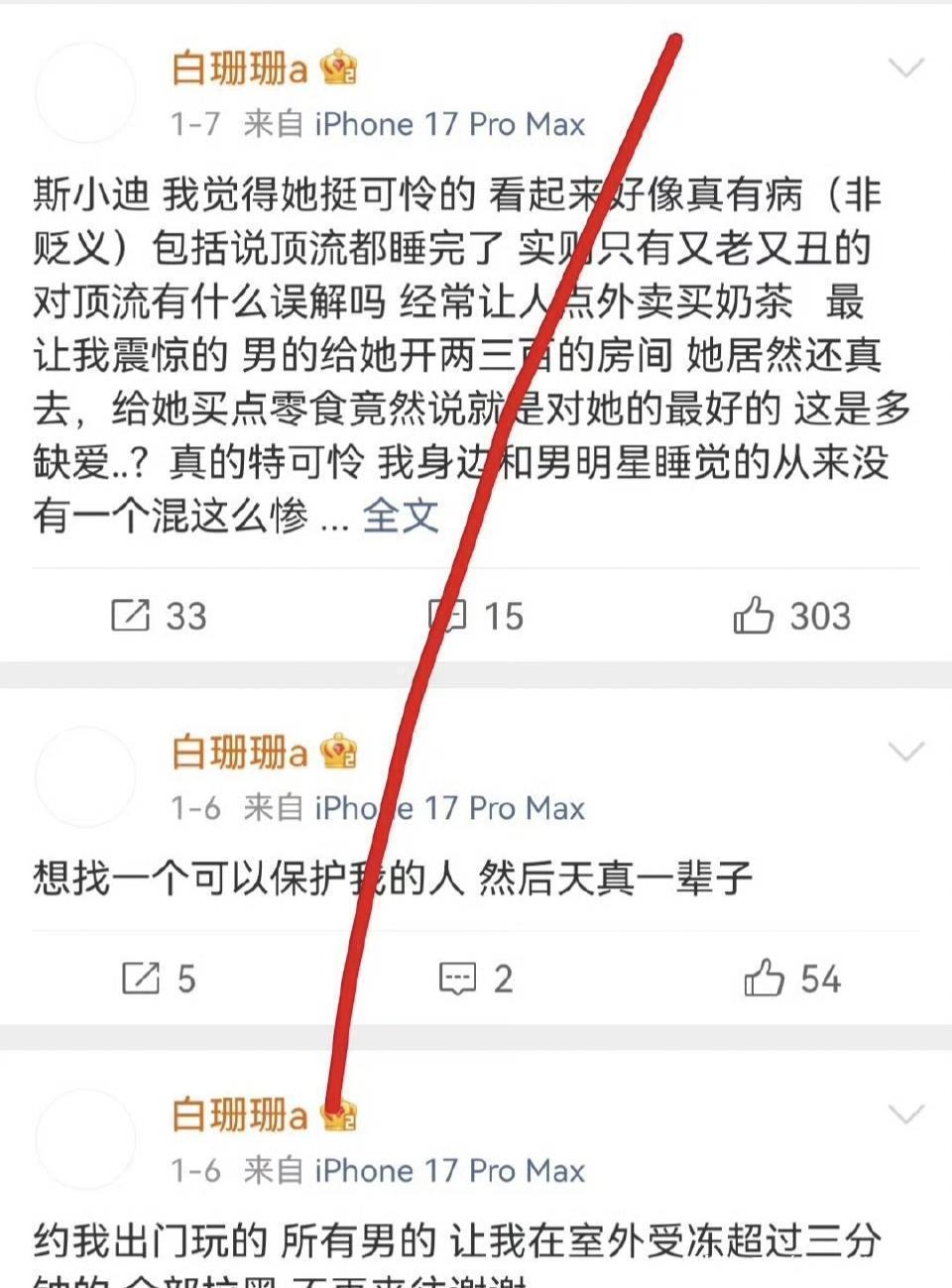 这个“白珊珊a”还说自己“比司晓迪年轻漂亮,睡的男明星更帅”,透露自己有夜场工作的背景,暗示知道不少娱乐圈的秘密。这种只说有料、就是不亮证据的做法,让网友们心里直打鼓。有人发现她的IP地址一会儿在浙江,一会儿在上海,更让人觉得不太靠谱。